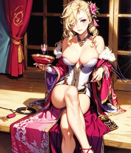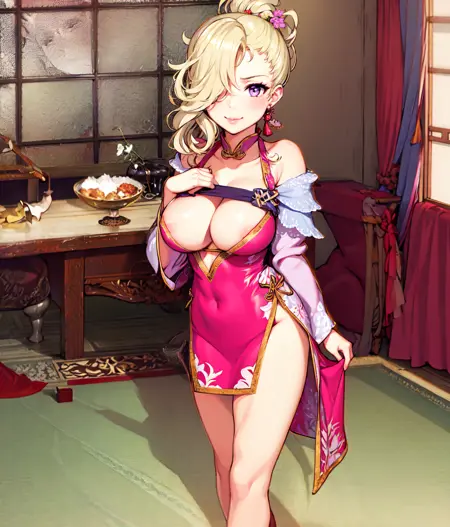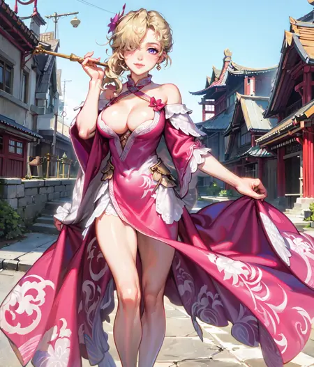 Notable tags: hair covering one eye, blonde, purple eyes, pink dress, long night dress, chinse clothes, bare leg, leg cut.