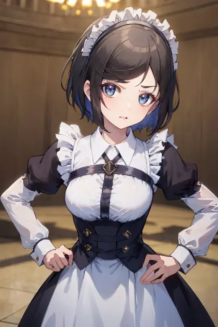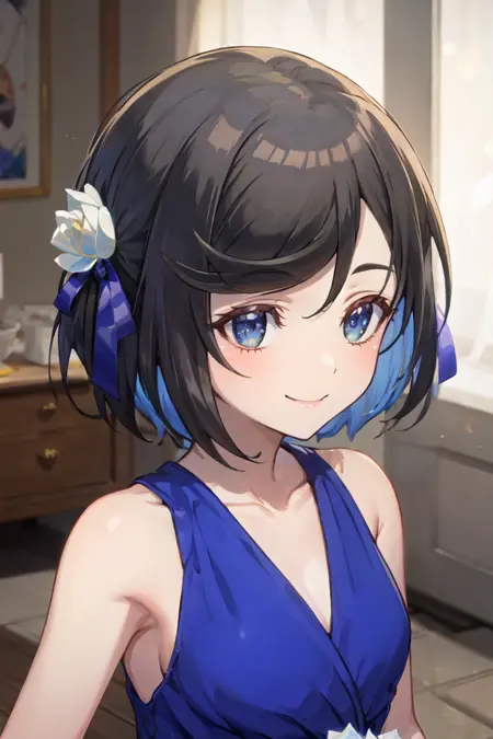 她的数据集较小且问题较多,服装可能不够准确,发带造型奇怪。由于领结的样式,AI会生成奇怪的图案。有时最好明确写上“平胸”。她的胸部尺寸在动漫风格中不稳定。