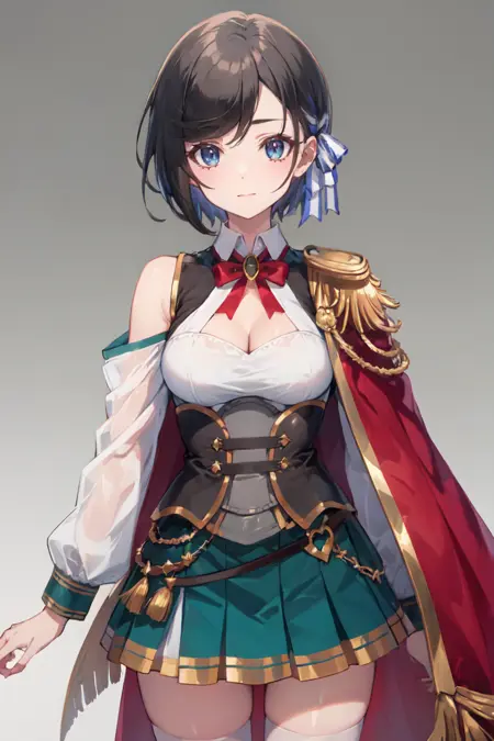 学院制服:白色发带、白衬衫、束腰、绿色裙子、胸口开衩、肩部开衩、长袖、红色斗篷、肩章、红色领结、白色过膝袜