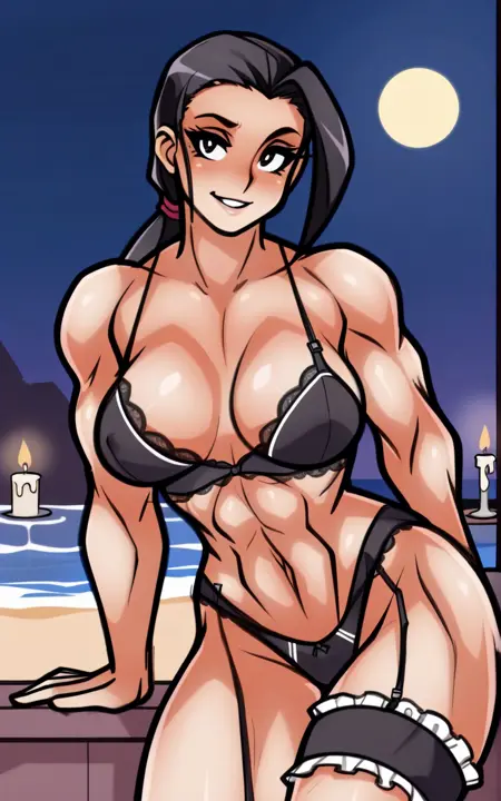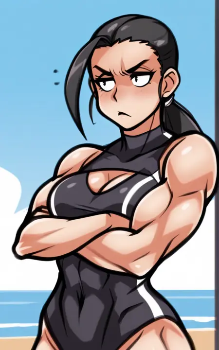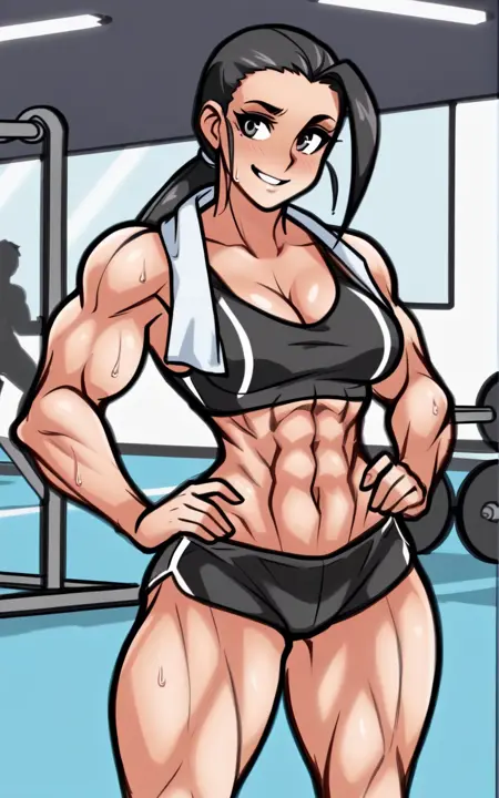 **Reinforcement Tags: **black hair, breasts, muscular female, ponytail, abs, navel, long hair