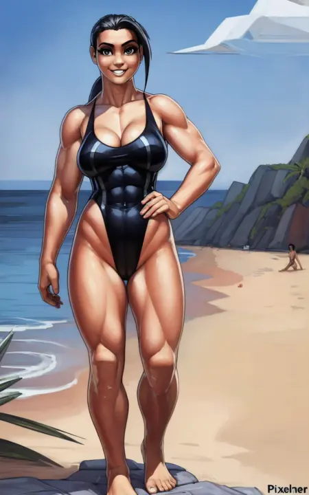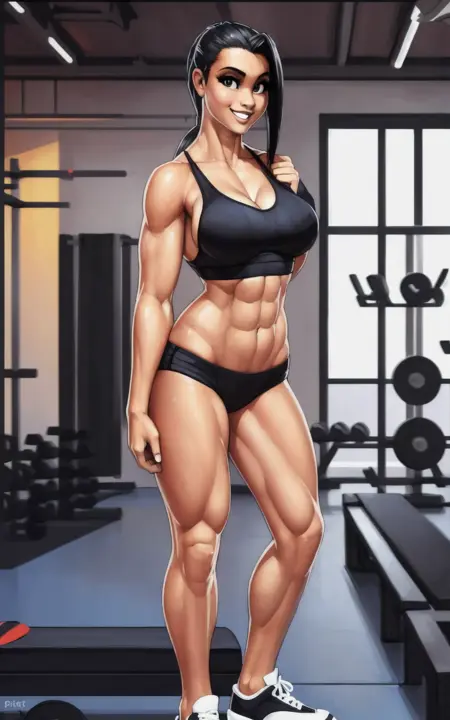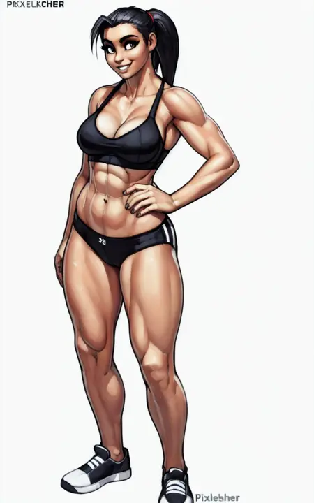 **Reinforcement Tags: **black hair, breasts, muscular female, ponytail, abs, navel, long hair