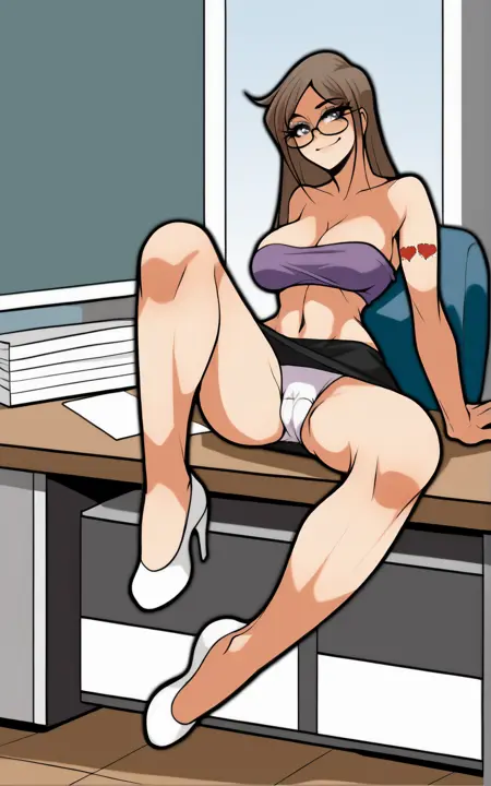 **For her Outfit: skirt, glasses, midriff, cleavage, miniskirt, blue skirt, shoes, white shoes, bandeau, purple bandeau