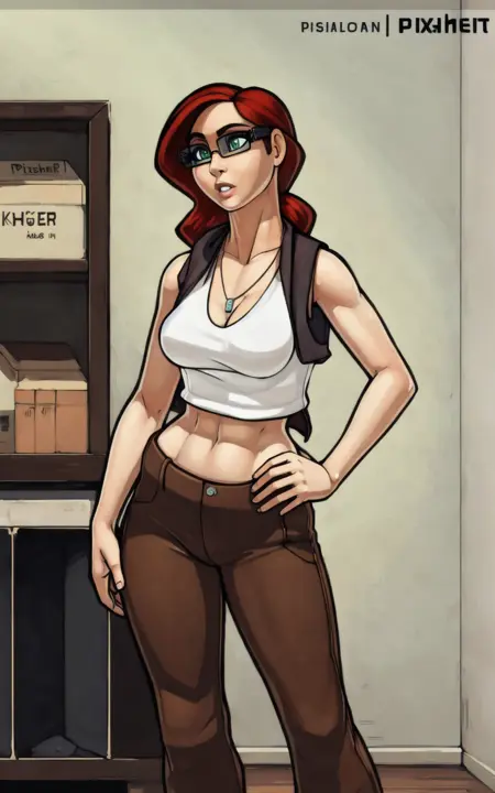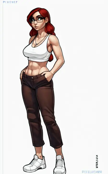 **For her Outfit: glasses, cleavage,pants, brown pants, necklace, black-framed eyewear, white crop top, crop top, sleeveless, midriff,  white footwear,white tank top,tank top, capri pants