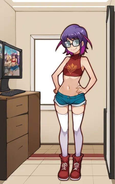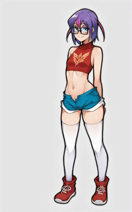 **For her Outfit: white footwear, white shoes, short shorts, thighhighs, white thighhighs, blue shorts, shorts, midriff, navel, crop top, red crop top, sleeveless turtleneck, sleeveless, bare shoulders, glasses, black-framed eyewear