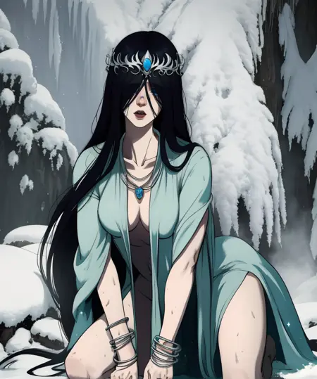 alsanna, very long black hair, (hair over eyes:1.3), long bangs, - lips,