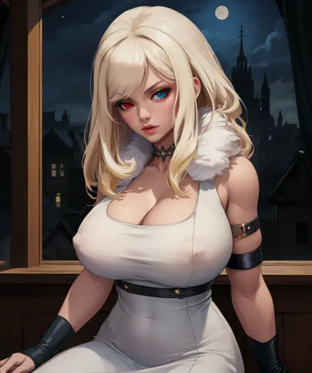 short dress, single shoulder pad, fur trim, armor, arm bands, - thigh highs, heels,