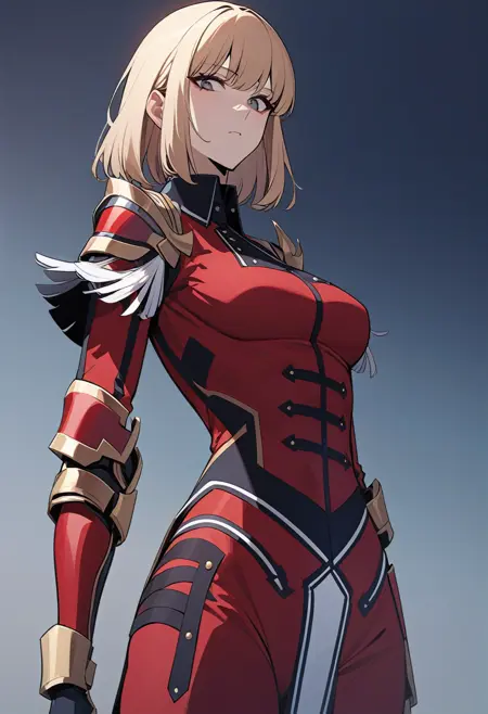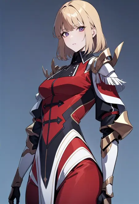 Default Outfit: red armor, black collar, shoulder armor, long sleeves, gauntlets, white pelvic curtain, red leggings