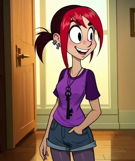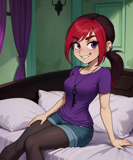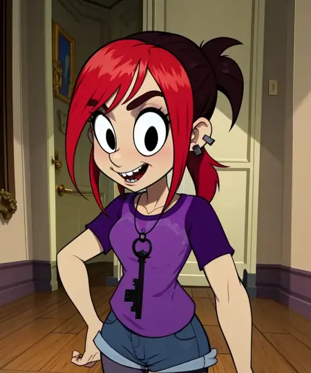 Mina, black eyes, red hair, two-tone hair, small ponytail, -