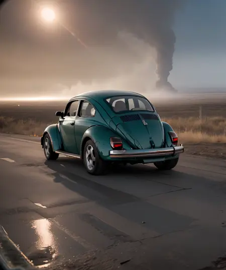 ,lora:quiron_beetleVW_V1_Lora:0.87 beetleVWQuiron car, masterpiece, best quality, official art, extremely detailed CG unity 8k wallpaper, illustration, light, official art, extremely detailed CG unity 8k wallpaper, illustration, day, beautiful detailed sky, light, highway, outdoors, 1car, (car:1), ground vehicle, vehicle focus, need for speed, moving, wet, realistic, stock photo, photograph,