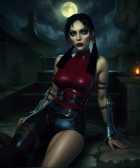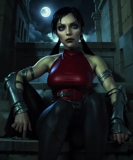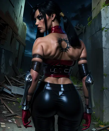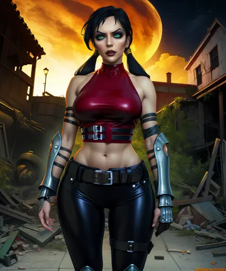 red sleeveless turtleneck, midriff, belt, leather pants, bridal gauntlets, shoulder wraps,