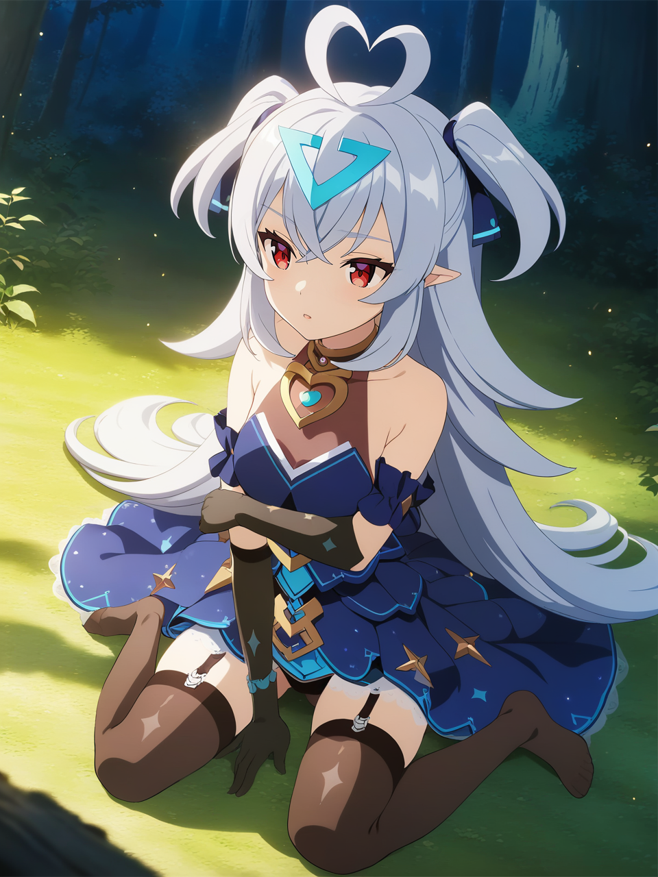dsdili, red eyes, long hair, two side up, hair ornament, pointy ears, ahoge, small breasts, blue dress, thighhighs, garter straps, gloves