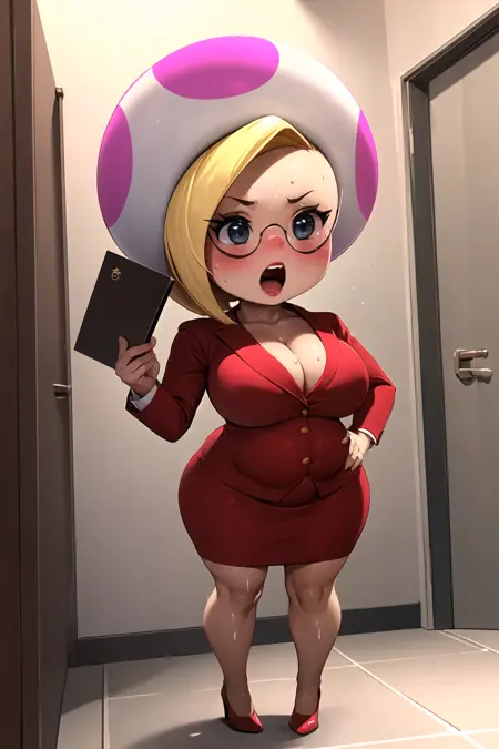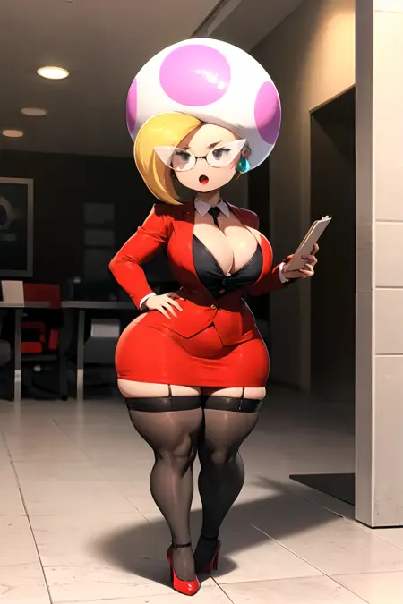 금발 머리, 안경, 사무직 여성, 버섯, 립스틱, 조린(Paper Mario), 토드(Mario), 버섯 인형, 빨간 립스틱, 하이힐, 치마, 빨간 신발, 연필 치마, 메이크업, 스커트 수트, 둥근 안경, 재킷, 검은 눈, 정장, 정식, 미니스커트, 짧은 머리, 미소