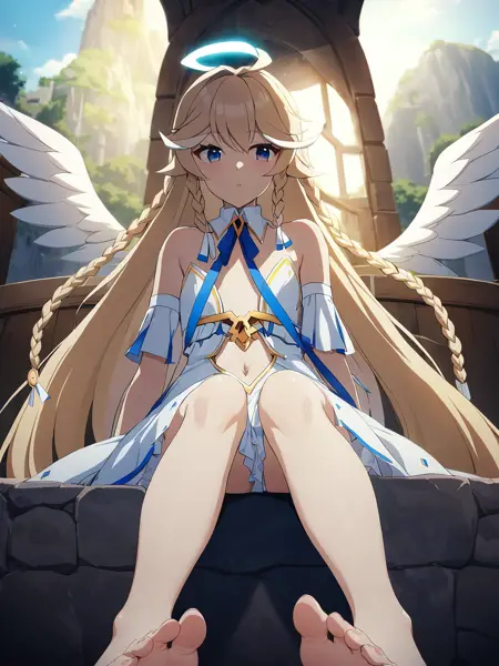 dsaola, 蓝眼睛, 金色头发, 极长发, 双马尾, 刘海, 天使发, 光环, 天使, 平胸, 白色连衣裙, 露脐, 手套, 分离式衣领, 无肩带, 颈部丝带, 蓝色丝带, 裸露肩膀, 天使之翼, 赤脚