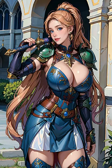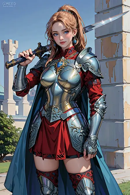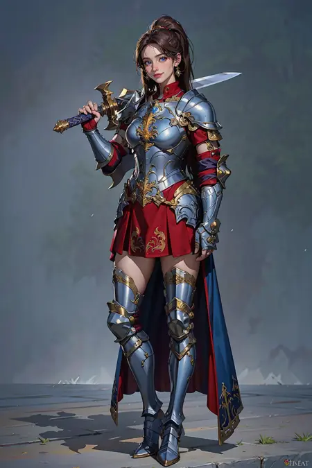 Major keyword : ((holding sword)), armor, greaves, armored boots, pauldrons, breastplate, gauntlets, knight, belt, cape, fur trim, standing, solo ,1girl