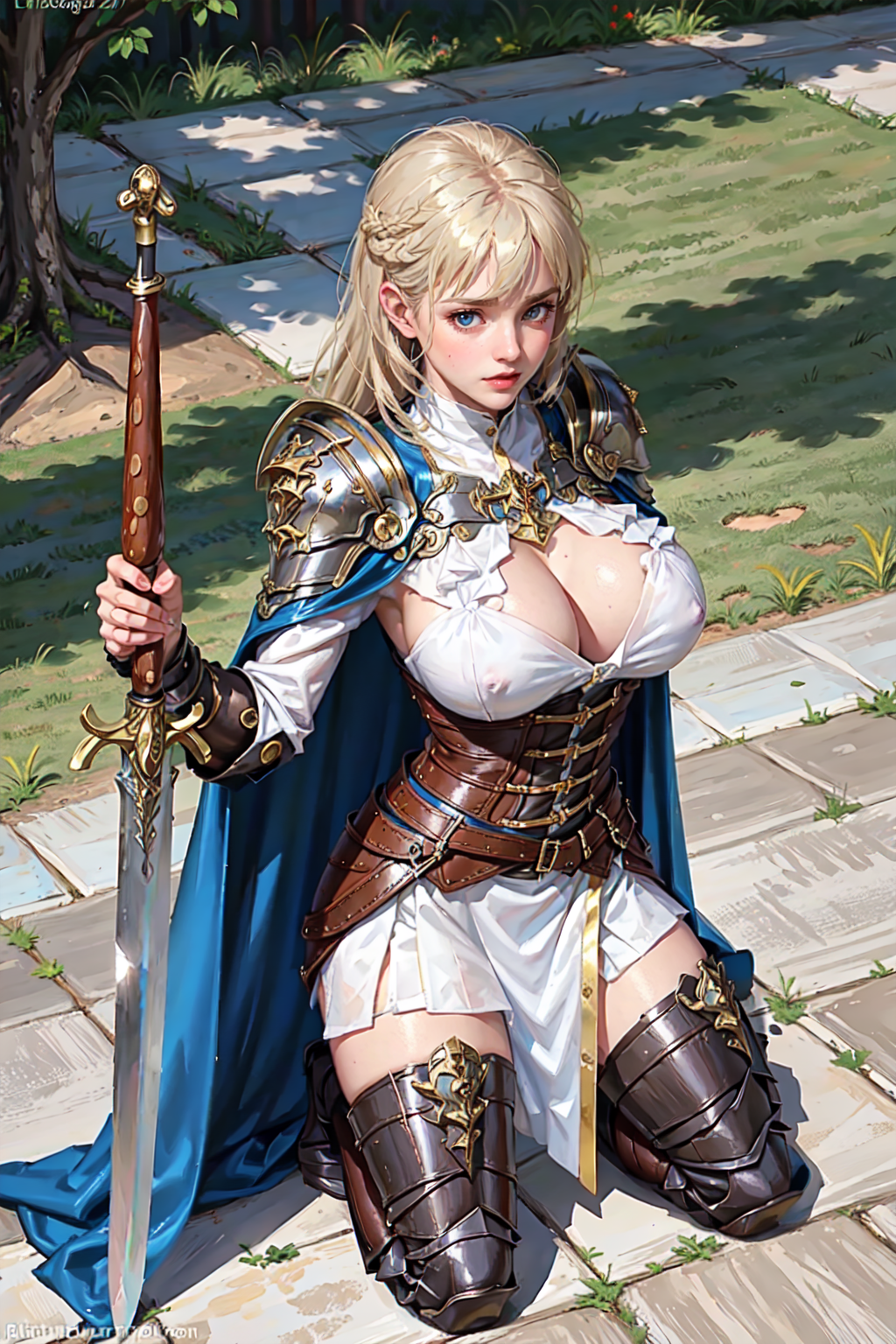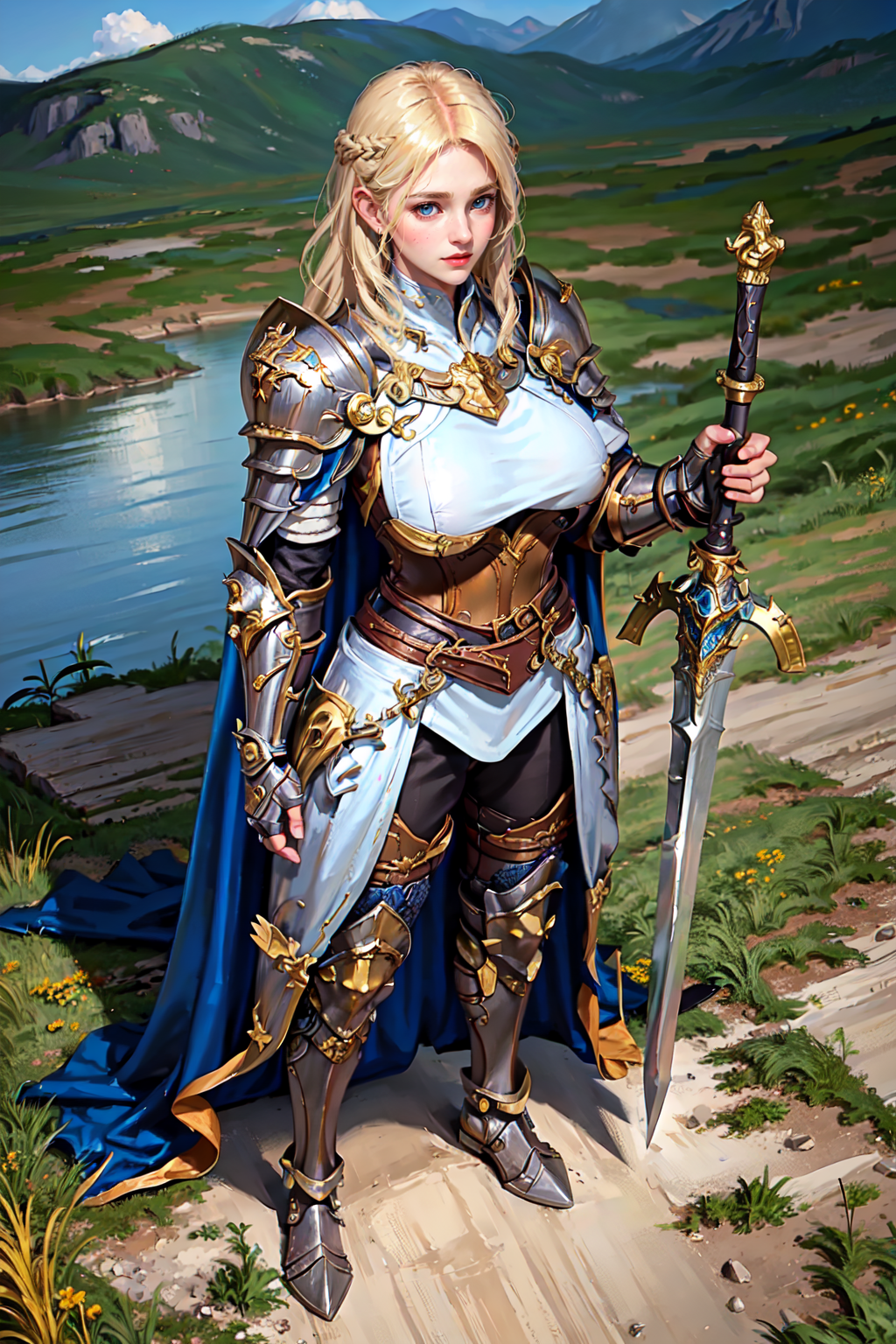 Major keyword : ((holding sword)), armor, greaves, armored boots, pauldrons, breastplate, gauntlets, knight, belt, cape, fur trim, standing, solo ,1girl