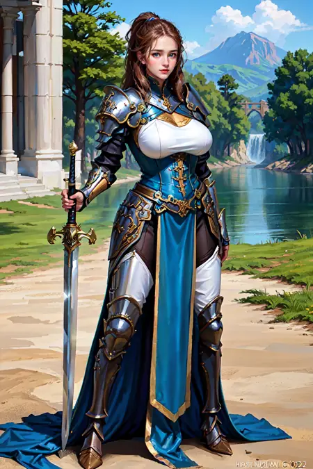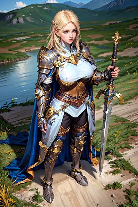 주요 키워드: ((검을 들고)), 갑옷, 정강이 보호대, 갑옷 부츠, 어깨 보호대, 가슴 보호대, 장갑, 기사, 허리띠, 망토, 털 장식, 서 있음, 혼자, 1소녀