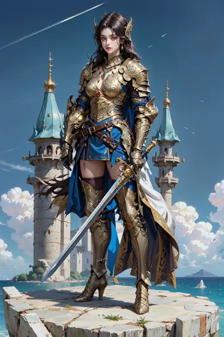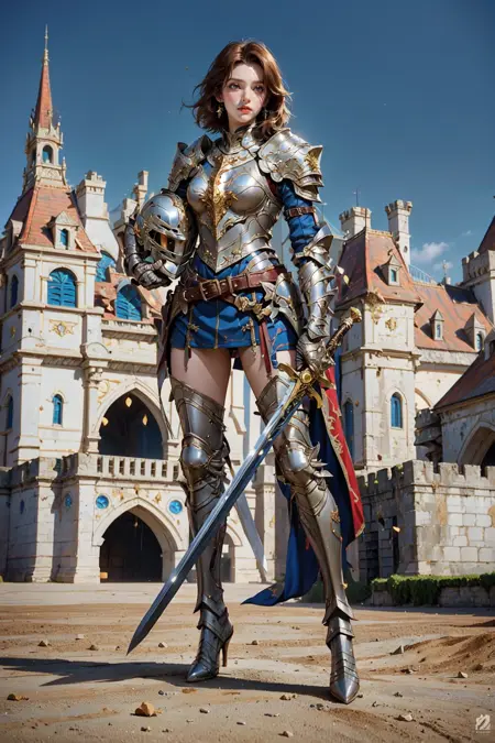 主要关键词:Sword_Helm,站立,全身,铠甲靴,护胫,腰带,骑士,项链,斗篷,盔甲,高跟鞋,((握剑)),肩甲,护臂,胸甲,护手,肩甲,全套盔甲,头盔已取下,((握头盔)),板甲