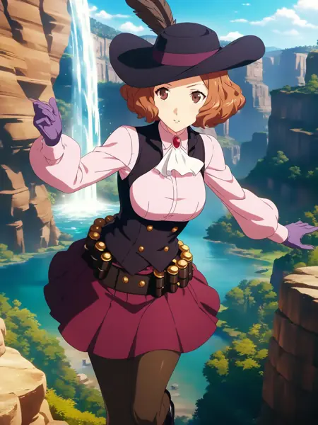 Noir: dsnoir, brown hair, short hair, brown eyes, pink shirt, ascot, skirt, vest, hat, hat feather, pantyhose, bandolier, purple gloves