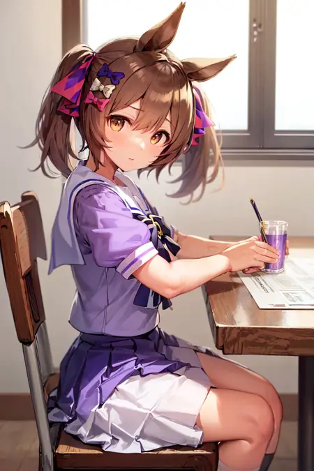 - Tracen学園制服、夏服、セーラーファッション、ふわっとした短いスリーブ、紫のネクタイ、馬蹄形の装飾、セーラーカラー、セーラーシャツ、紫シャツ、白いスカート、プリーツスカート、フリル、ミニスカート、絶対良妻(zettai ryouiki)、白のハイソックス、茶色のシューズ、ローファー