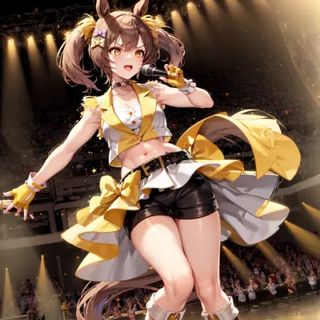 - 公式別バージョン衣装、ヘアリボン、星型ヘアアコモード、チョーカー、指なしグローブ、黄色のグローブ、クロップトップ、ノースリーブジャケット、マジルフ、へそ、ベルト、黄色のリボン、白いスカート、プリーツスカート、スカート内にショートパンツ、黒のショートパンツ、自転車ショーツ、ブーツ