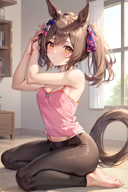 - ヘアリボン、ヘアバンディット、ノースリーブ、ストラップスリップ、ピンクシャツ、ピンクのキャミソール、タンクトップ、裸の肩、トレーナーパンツ、黒のパンツ、レギンス、ヨガパンツ