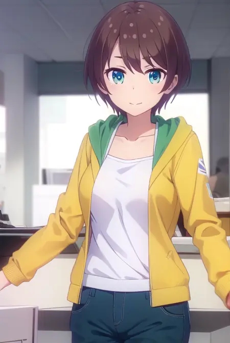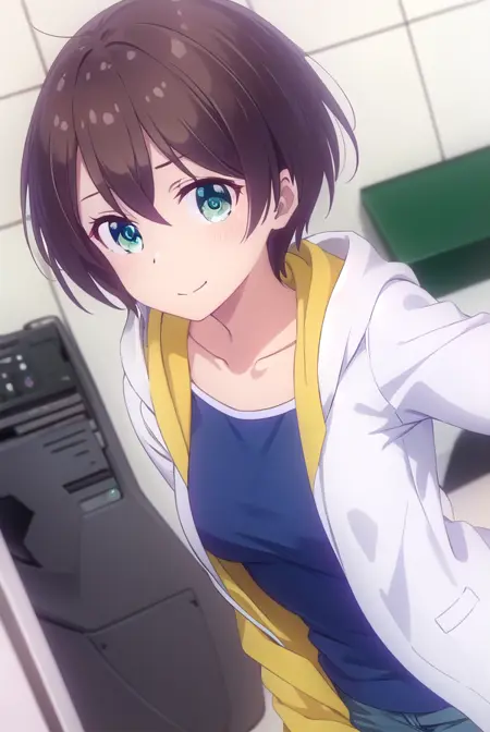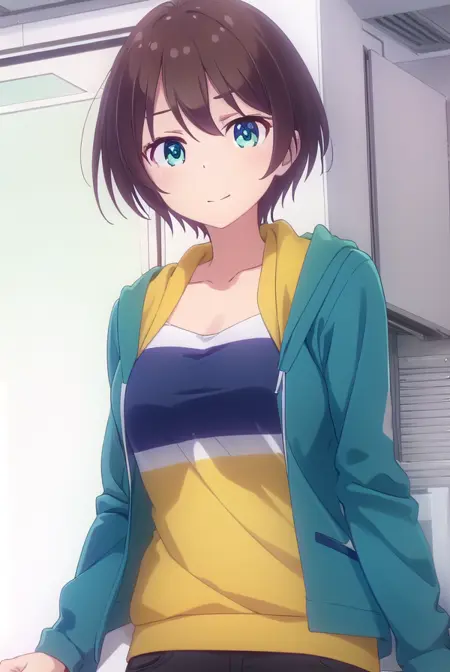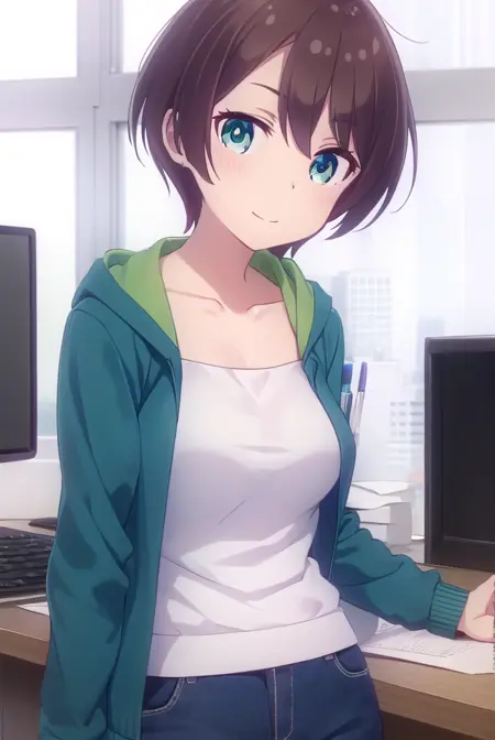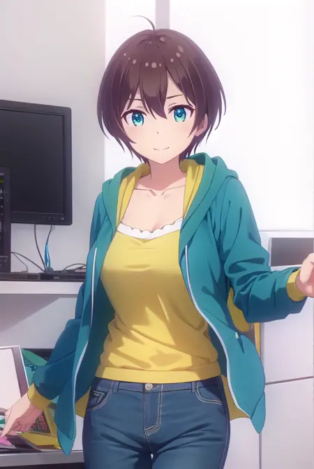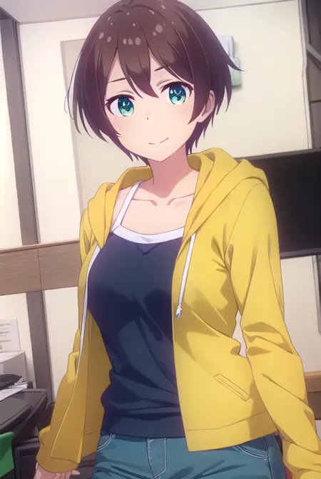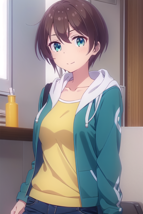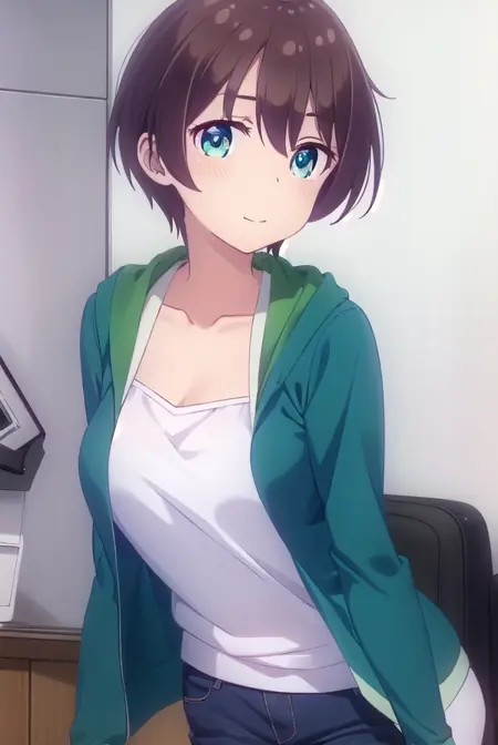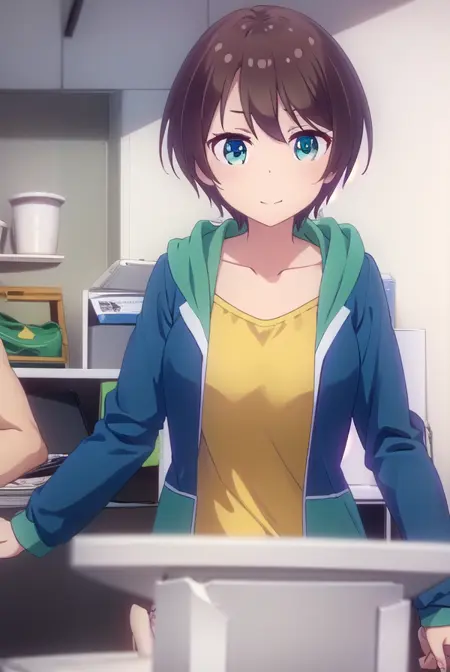 hajime shinoda, short hair, bangs, brown hair, (green eyes:1.3), ahoge,