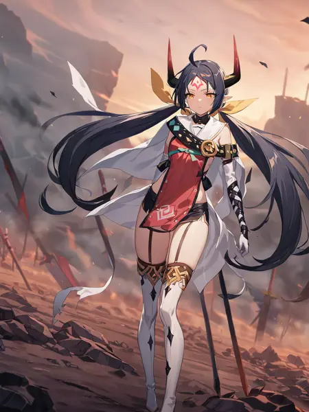 dsaravi, black hair, yellow eyes, pointy ears, very long hair, twintails, ahoge, horns, forehead mark, hair ribbon, red tabard, chest belt, elbow gloves, thighhigh boots, black shorts