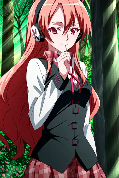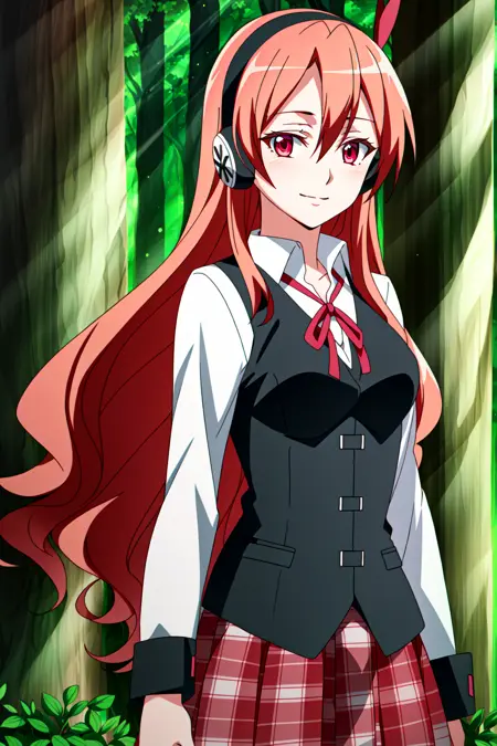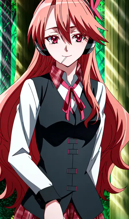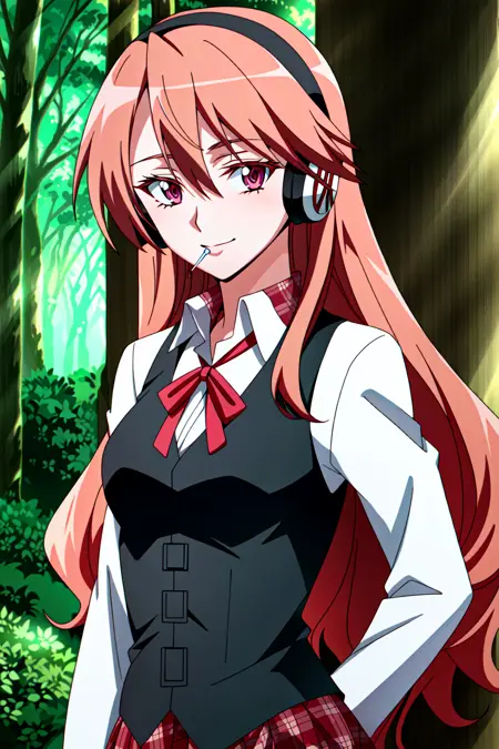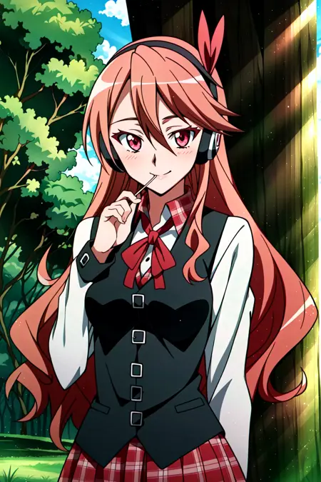 Chelsea, 1girl, solo, long hair, headphones, red hair, plaid, smile, red eyes, vest, lollipop, plaid skirt, looking at viewer, tree, long sleeves, candy, pink eyes