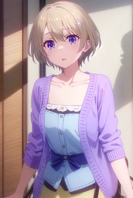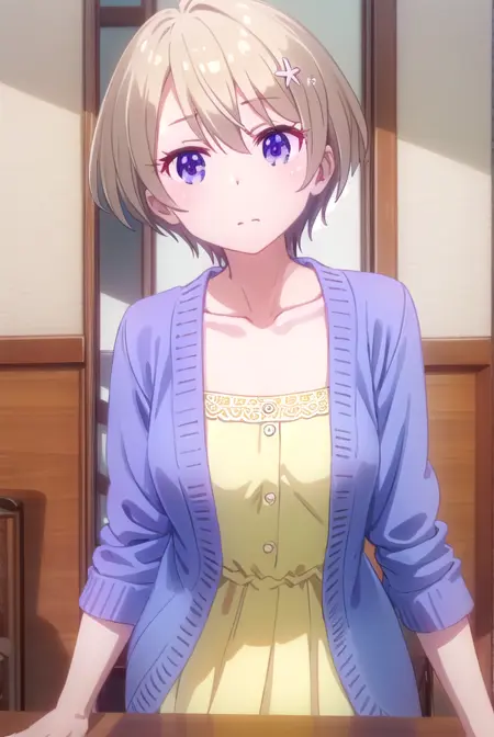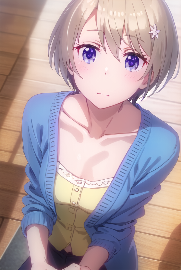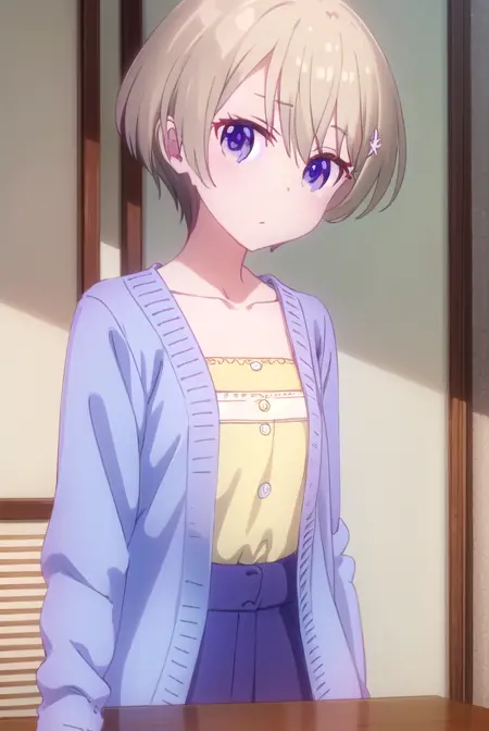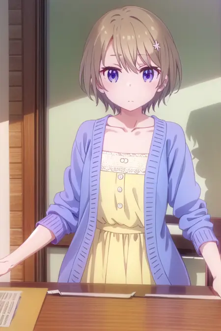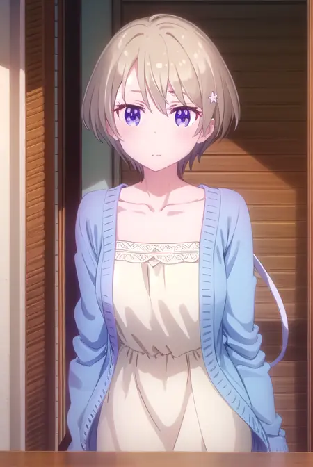hotaru hoshikawa, short hair, brown hair, hair ornament, hair between eyes, (purple eyes:1.1), flower, hair flower,