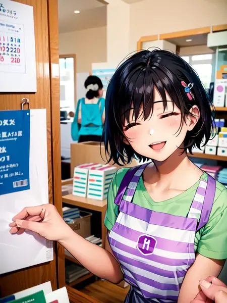 SB1, 1boy, 1girl, black hair, apron, indoors, striped shirt, shirt, open mouth, closed eyes, short hair, shop, purple shirt, calendar (object), smile,