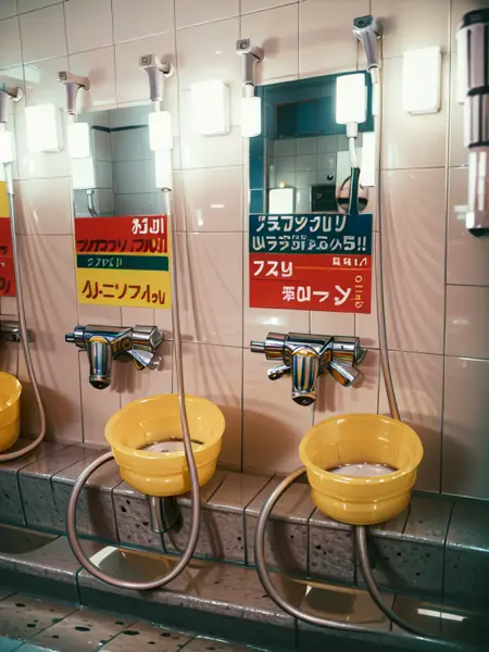 ※ケロリン桶は、多くの日本の公共浴場に設置されている薬品メーカー「ケロリン」の広告付きの黄色い桶です。
