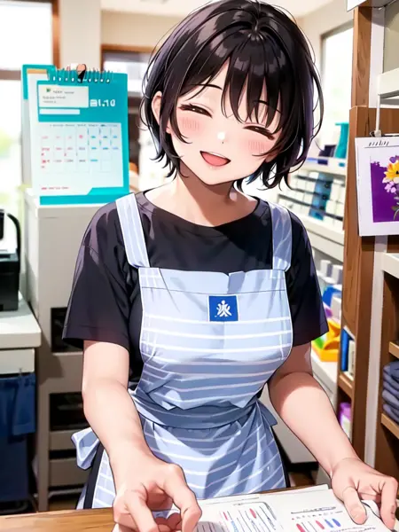 SB1, 1남자, 1여자, 검은 머리, 앞치마, 실내, 줄무늬 셔츠, 셔츠, 벌린 입, 감은 눈, 짧은 머리, 상점, 보라색 셔츠, 캘린더(물건), 미소,