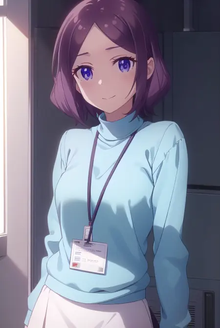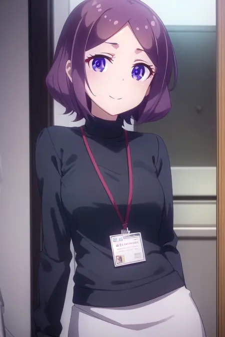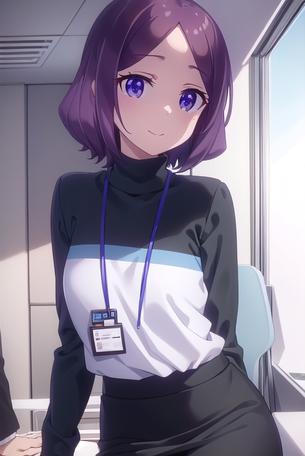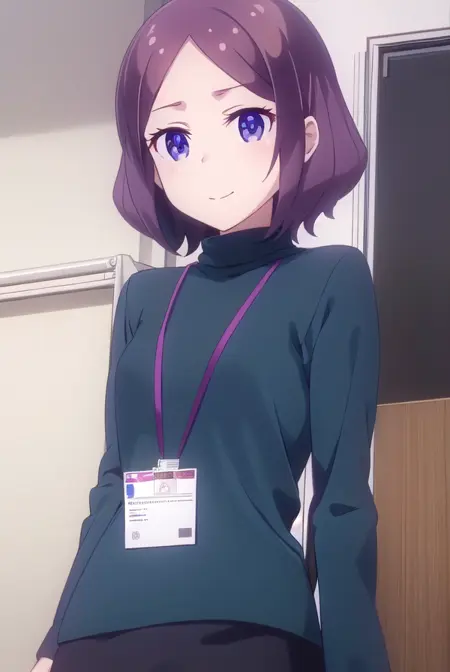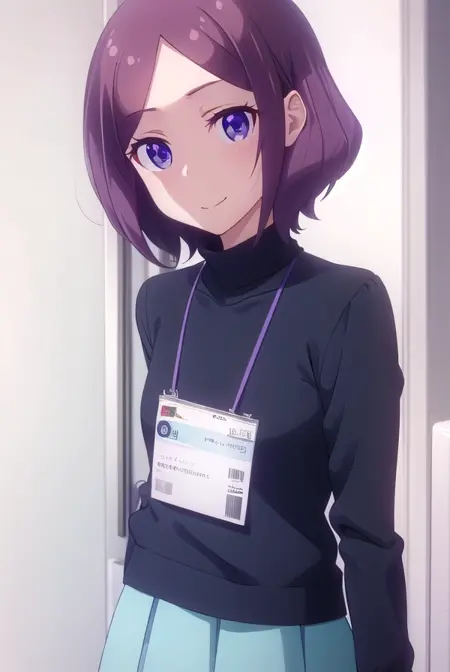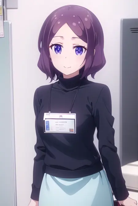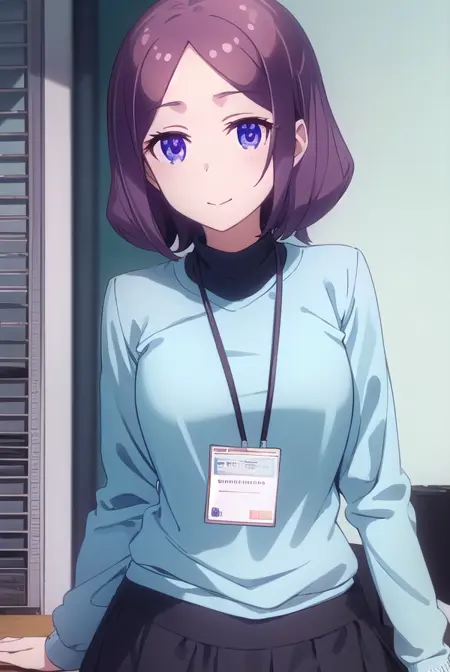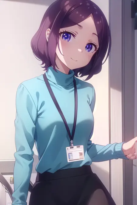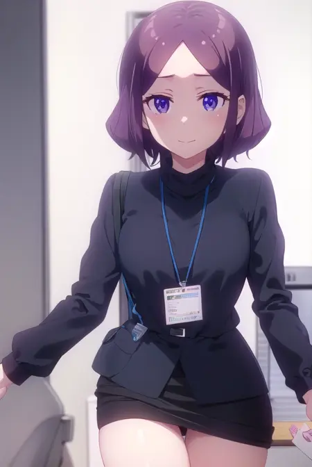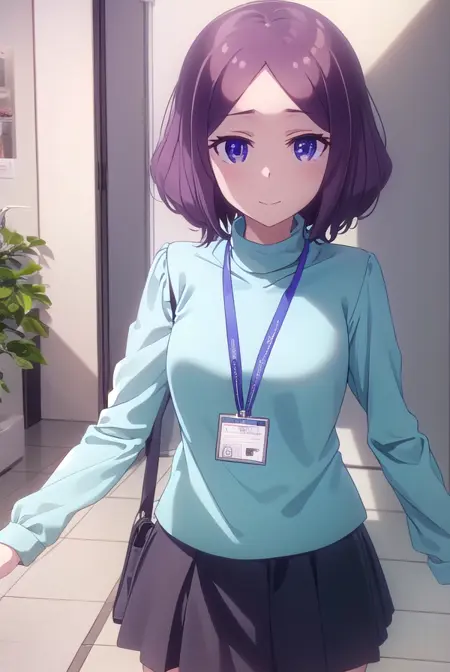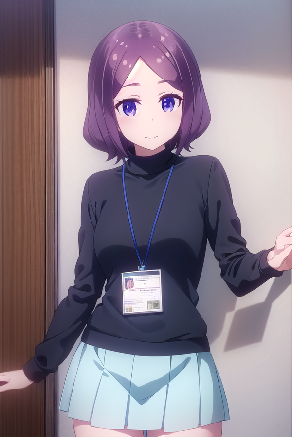 skirt, shirt, long sleeves, black skirt, turtleneck, blue shirt, id card, lanyard,