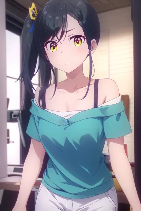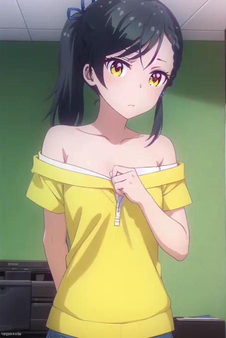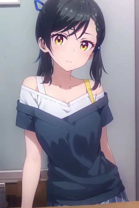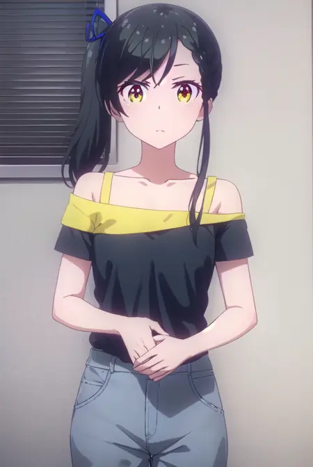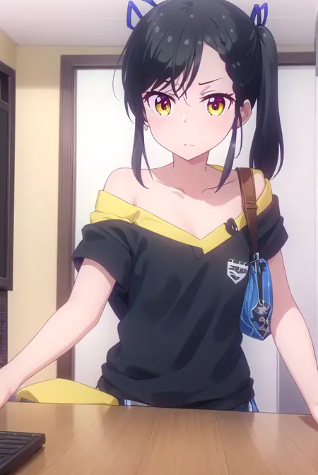つばめなるみ、黒髪、リボン、ヘアリボン、(黄色い目:1.3)、サイドポニーテール、編み込み、単一の編み込み、