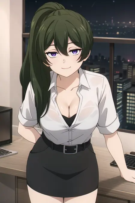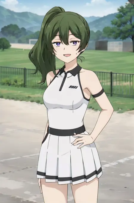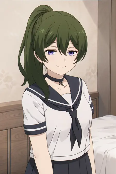<lora:Ubel-v1-06:0.6>, ChopioUbel, 长发, 绿发, 高马尾, 侧马尾, 发丝遮眼, 半闭双眼, 紫色眼睛, (注视观众:1.3),