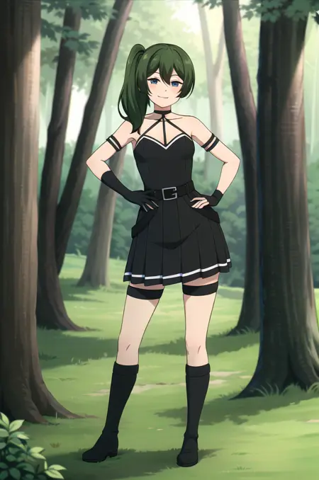 outfit_1, 项圈, 黑色连衣裙, 百褶裙, 无袖连衣裙, 裸露肩膀, 单肘手套, 臂环, 手臂绑带, 腰带, 大腿绑带, 黑色长靴,