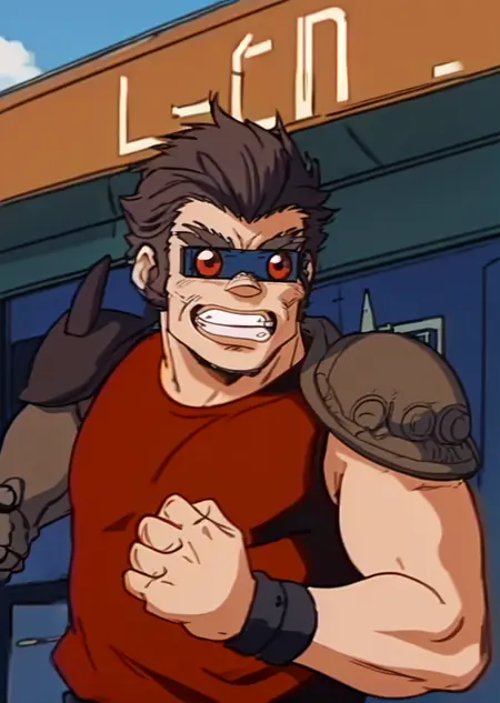 buaku, ソロ, 男性, 年配, クローズアップ, 短髪, 赤いレンズのビーサー, 赤いシャツ, にやりと笑う
