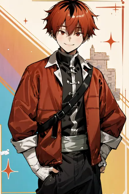 Stark default outfit: red jacket open clothes black pants