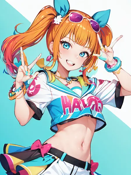 prompt : flashy gyaru, happy, showy,too many accessories, colorful ,kogal,