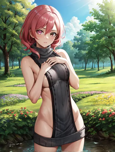_breasts, brown hair, brown eyes, heterochromia, hair between eyes, pink hair, multicolored hair, pink eyes, short hair, bangs, shiny hair, two-tone hair, split-color hair,