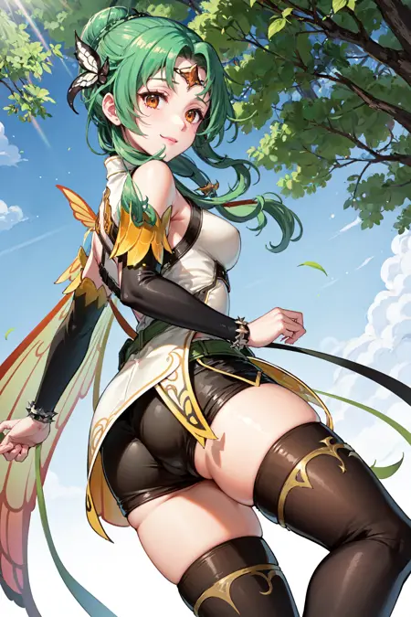 【Resplendent outfit】: res_elincia, butterfly wings, shoulder armor, gradient clothes, thigh boots, thighhighs ,short sleeveless dress, jewelry, thorns, sleeveless, bridal gauntlets, thighs, bracelet, zettai ryouiki, gold trim, elbow gloves, black shorts, leaf