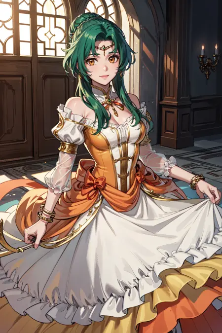 【Path of Radiance outfit】: pat_elincia, orange long dress, light orange long skirt, orange puffy long sleeves, jewelry, earrings, red shoes, juliet sleeves, ribbon