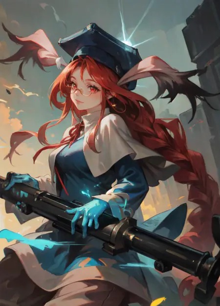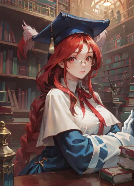 Default Outfit: BoFMomo, animal ears, single braid, red eyes, glasses, hat, white capelet, blue dress, blue sleeves, pants, red ribbon, gloves, boots