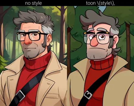 v1.0 NEW - A small update for v1.0 - Captions have been changed and improved, Trigger Word has also been changed, Some images have also been improved. Images with a style similar to Gravity Falls have been marked with the toon\(style\) token, so use this token to make the style look like GF and do not use score in this case! (31.08.2024)