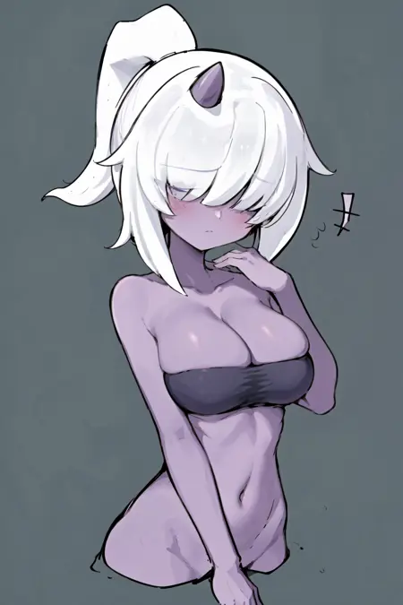 Prompts are : Dazzi, 1girl, (cloud:1.2), white hair, ponytail, oni, horn, hair over eyes, white cloud, (purple skin:1.2), (split form), legless, no legs, no eyes, single horn, bottomless, best quality,