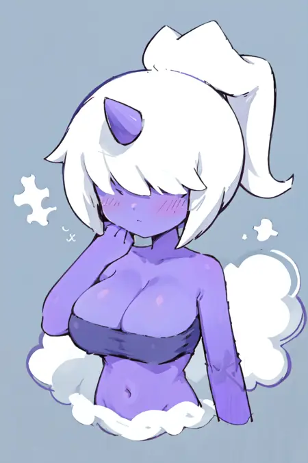 So, what's new ? I came to like this version a lot better ! The overall quality of the gens should look better already, her skin color should be more purple instead of pink/light purple ! And the cloud is way more present, still not guaranteed, but it's an improvement ! I don't think I'll make a 3.0 until a long time, I finally am satisfied with the LoRA.
