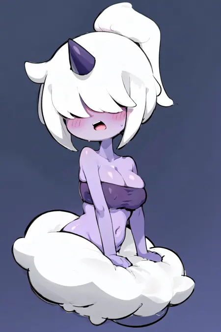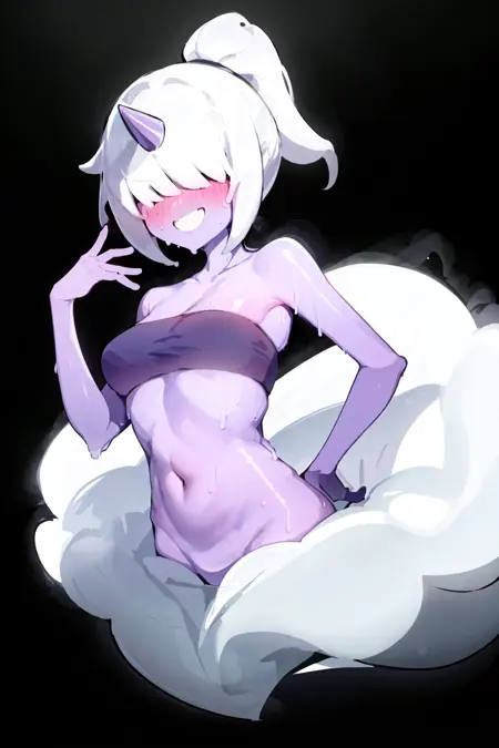 Prompts are : Dazzi, 1girl, (cloud:1.2), white hair, ponytail, oni, horn, hair over eyes, white cloud, (purple skin:1.2), (split form), legless, no legs, no eyes, single horn, bottomless, best quality,