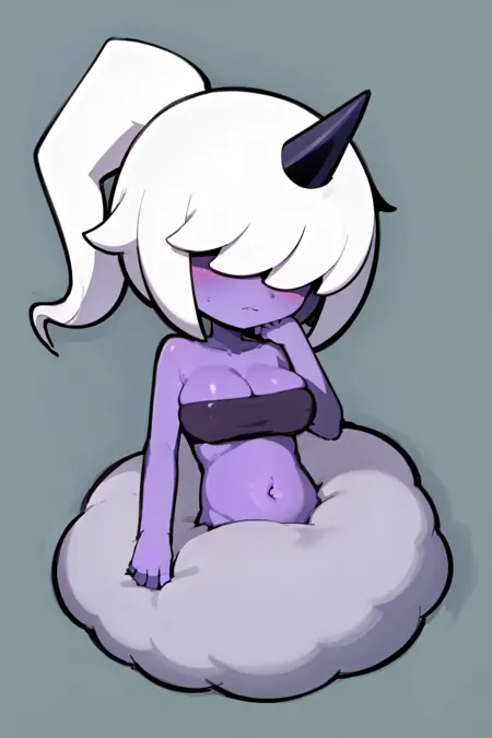 Prompts are : Dazzi, 1girl, (cloud:1.2), white hair, ponytail, oni, horn, hair over eyes, white cloud, (purple skin:1.2), (split form), legless, no legs, no eyes, single horn, bottomless, best quality,