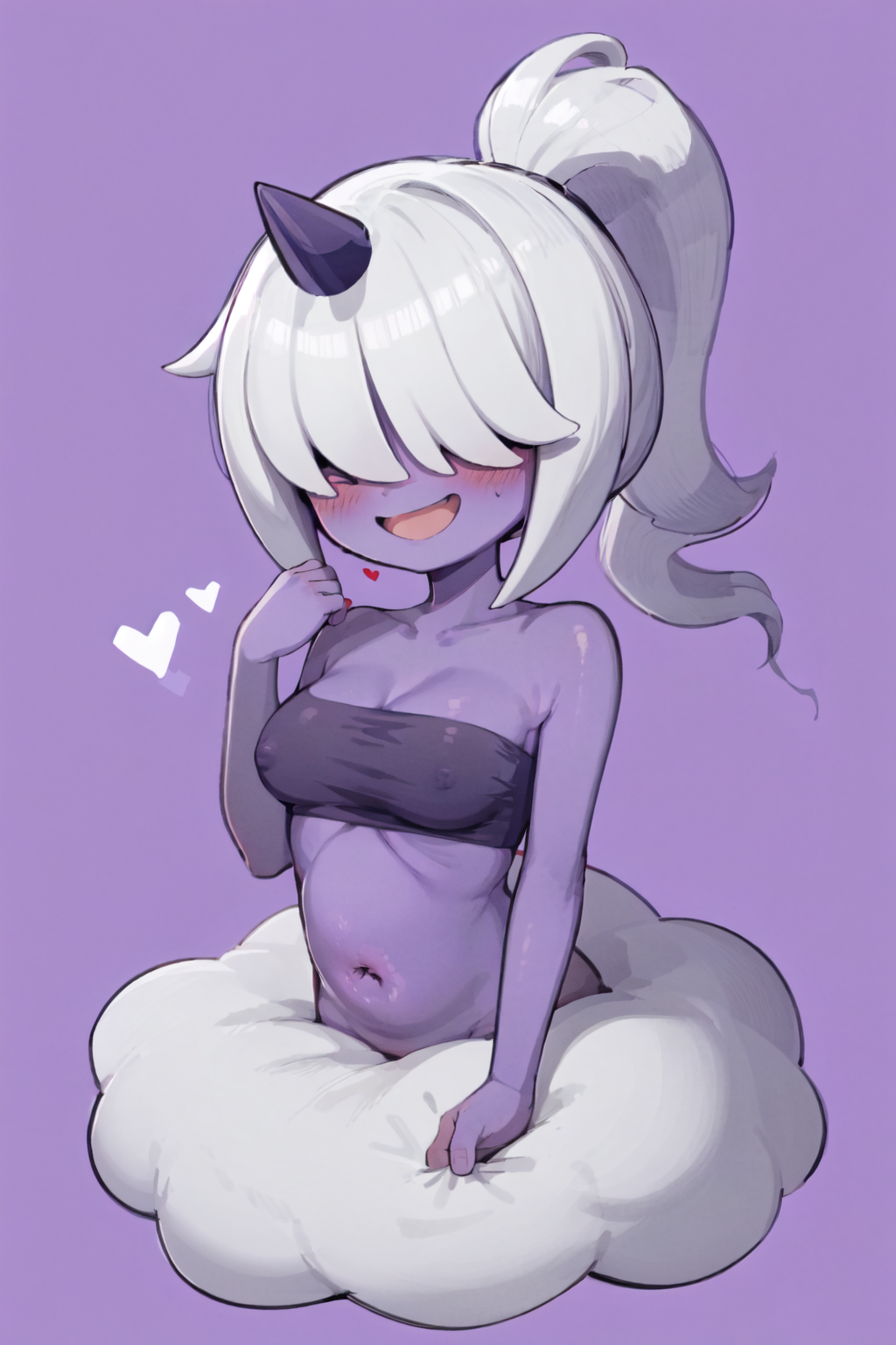 So, what's new ? I came to like this version a lot better ! The overall quality of the gens should look better already, her skin color should be more purple instead of pink/light purple ! And the cloud is way more present, still not guaranteed, but it's an improvement ! I don't think I'll make a 3.0 until a long time, I finally am satisfied with the LoRA.