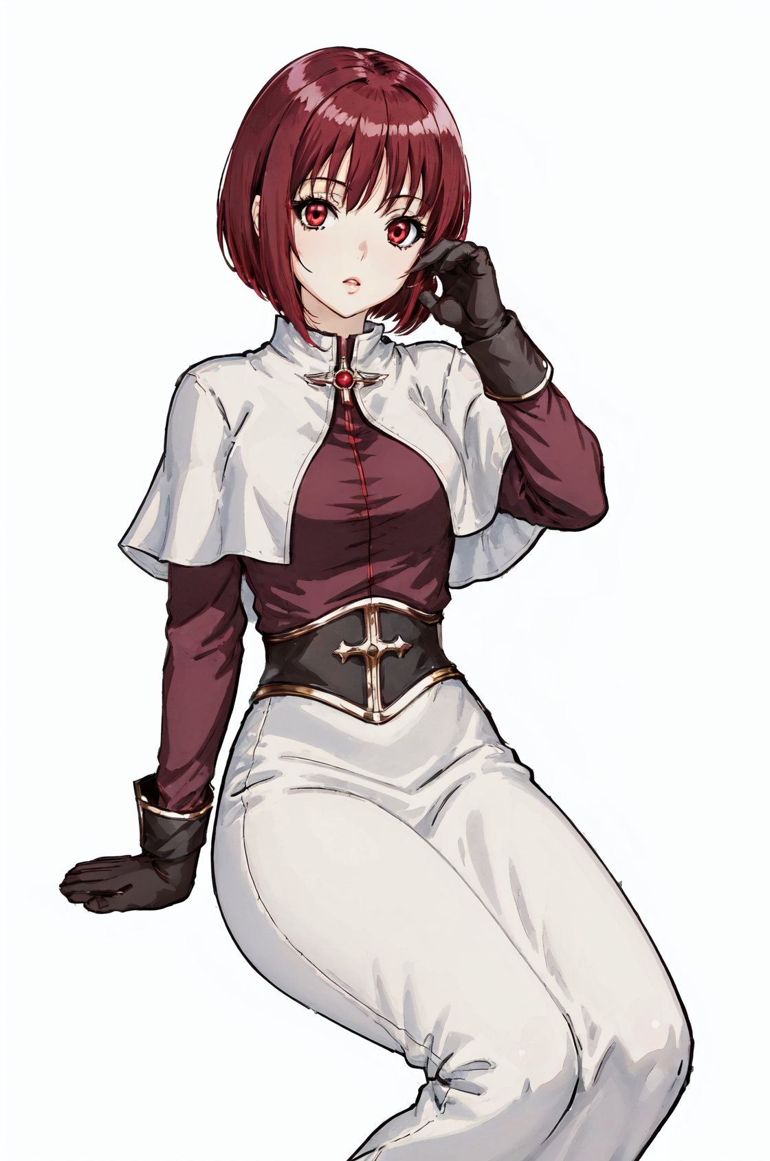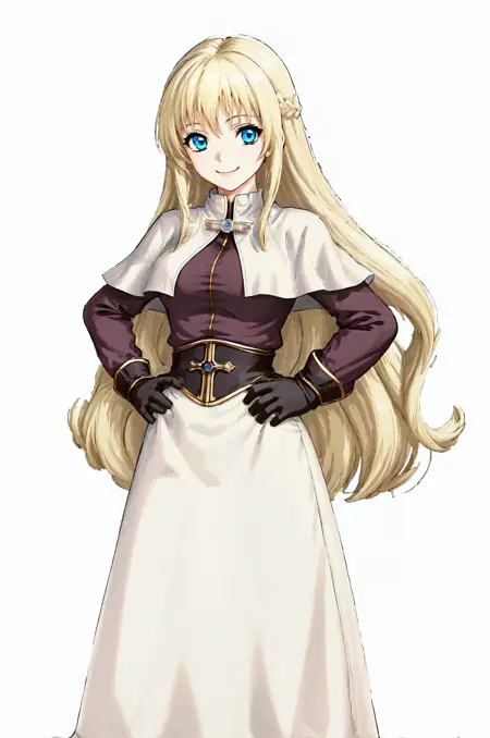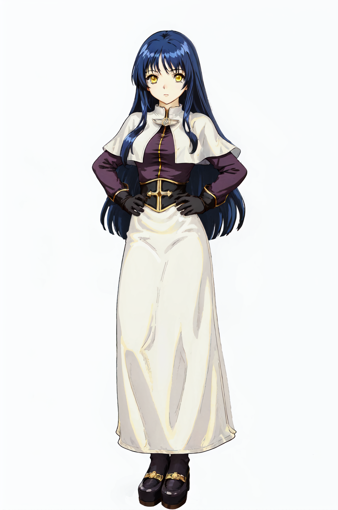 prompt: acoRO, white capelet, white dress, brown gloves, brown cuff, long sleeves, skirt, black pantyhose, long skirt, pencil skirt, corset
